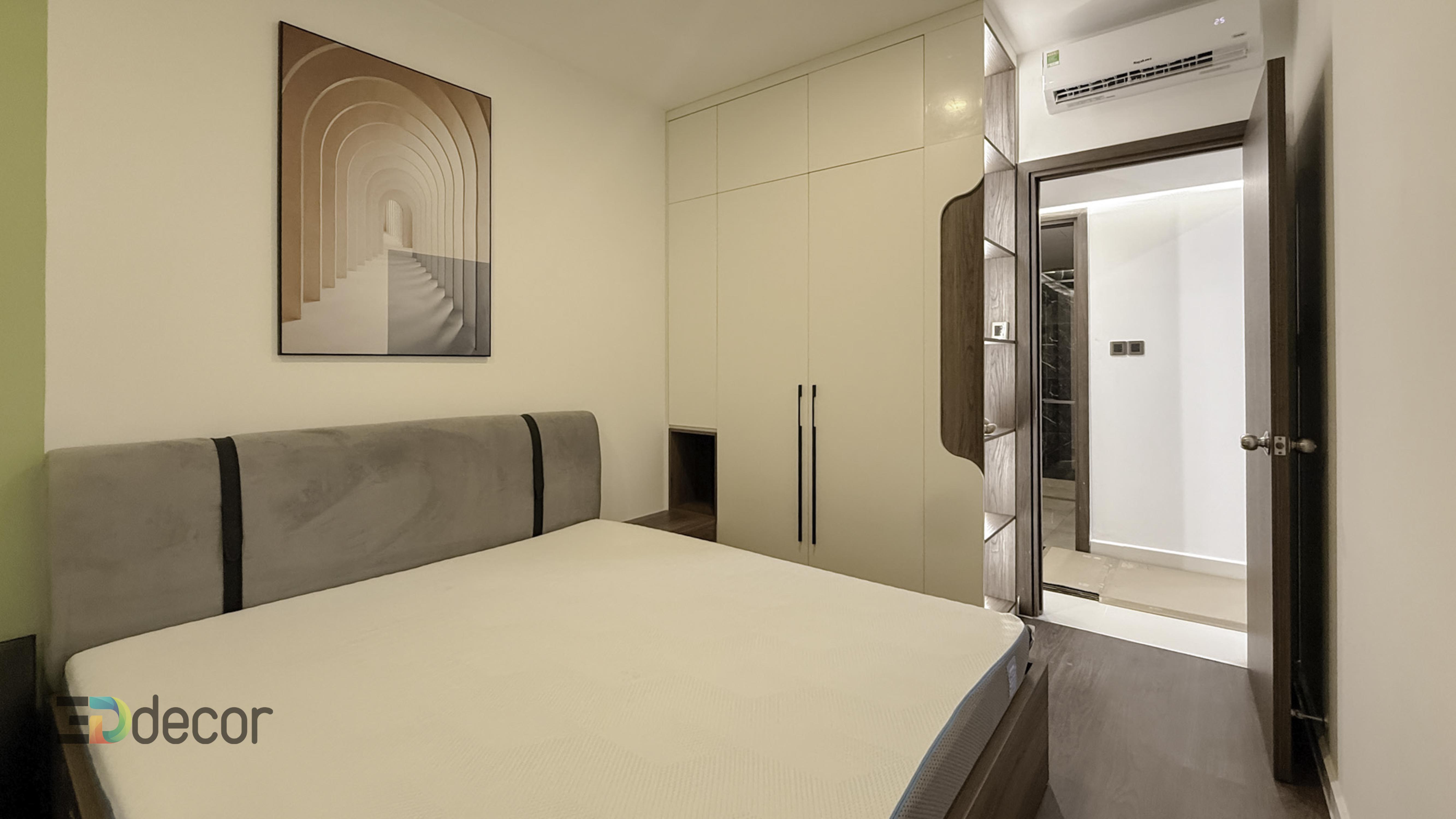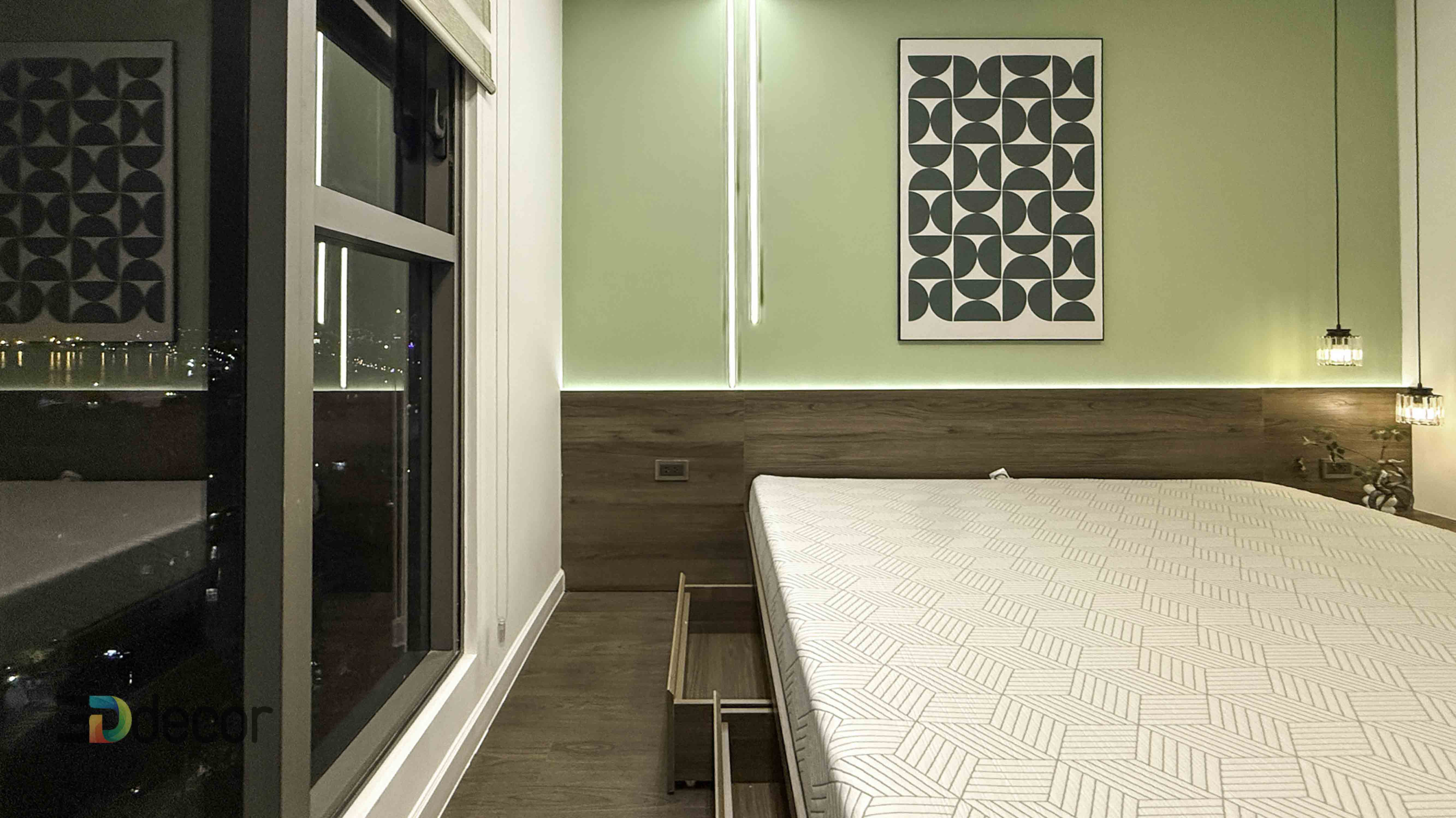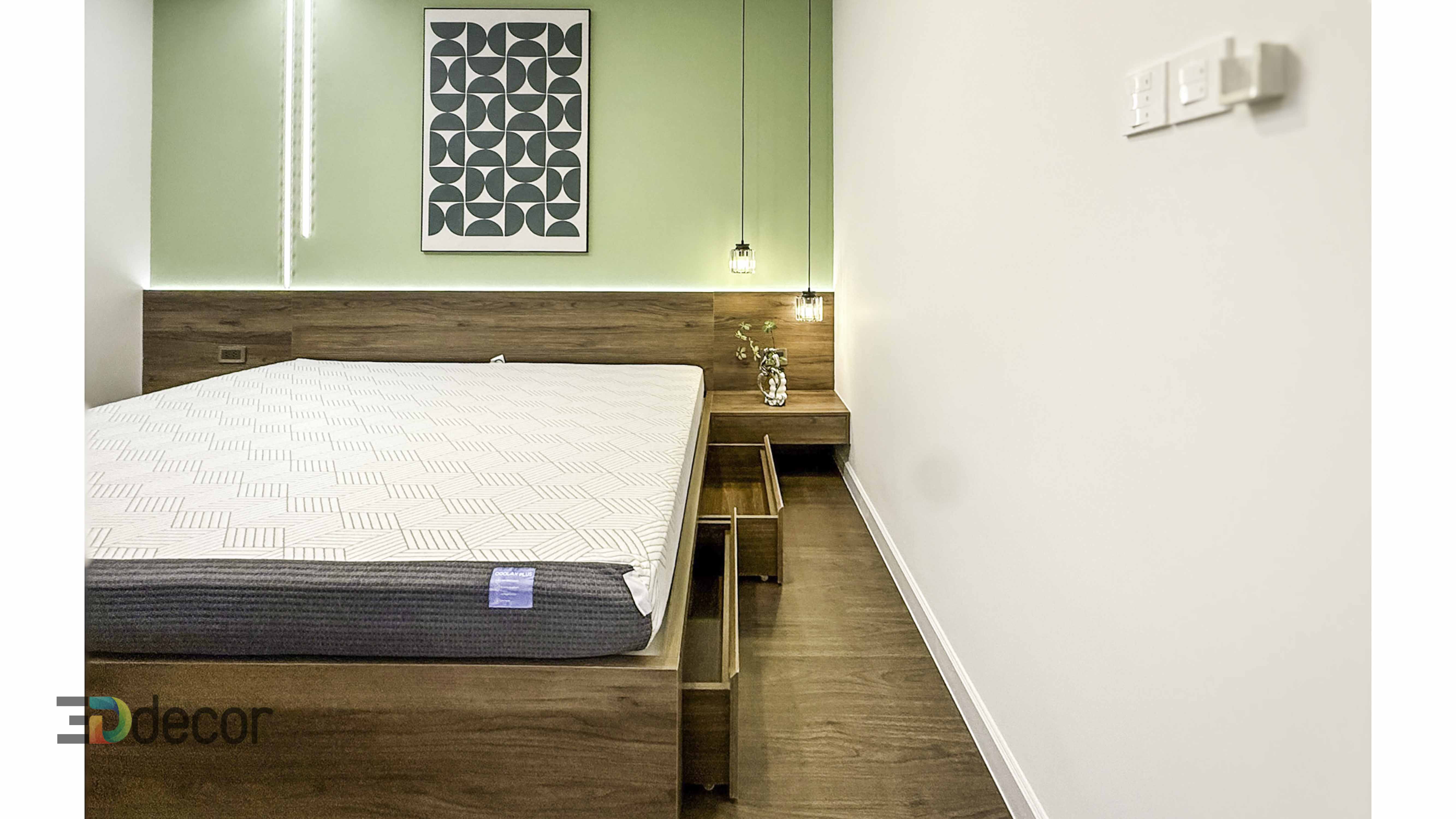 Phòng ngủ ấm cúng, kết hợp ánh sáng nhẹ nhàng, mang lại giấc ngủ sâu và sự thư giãn tuyệt đối.