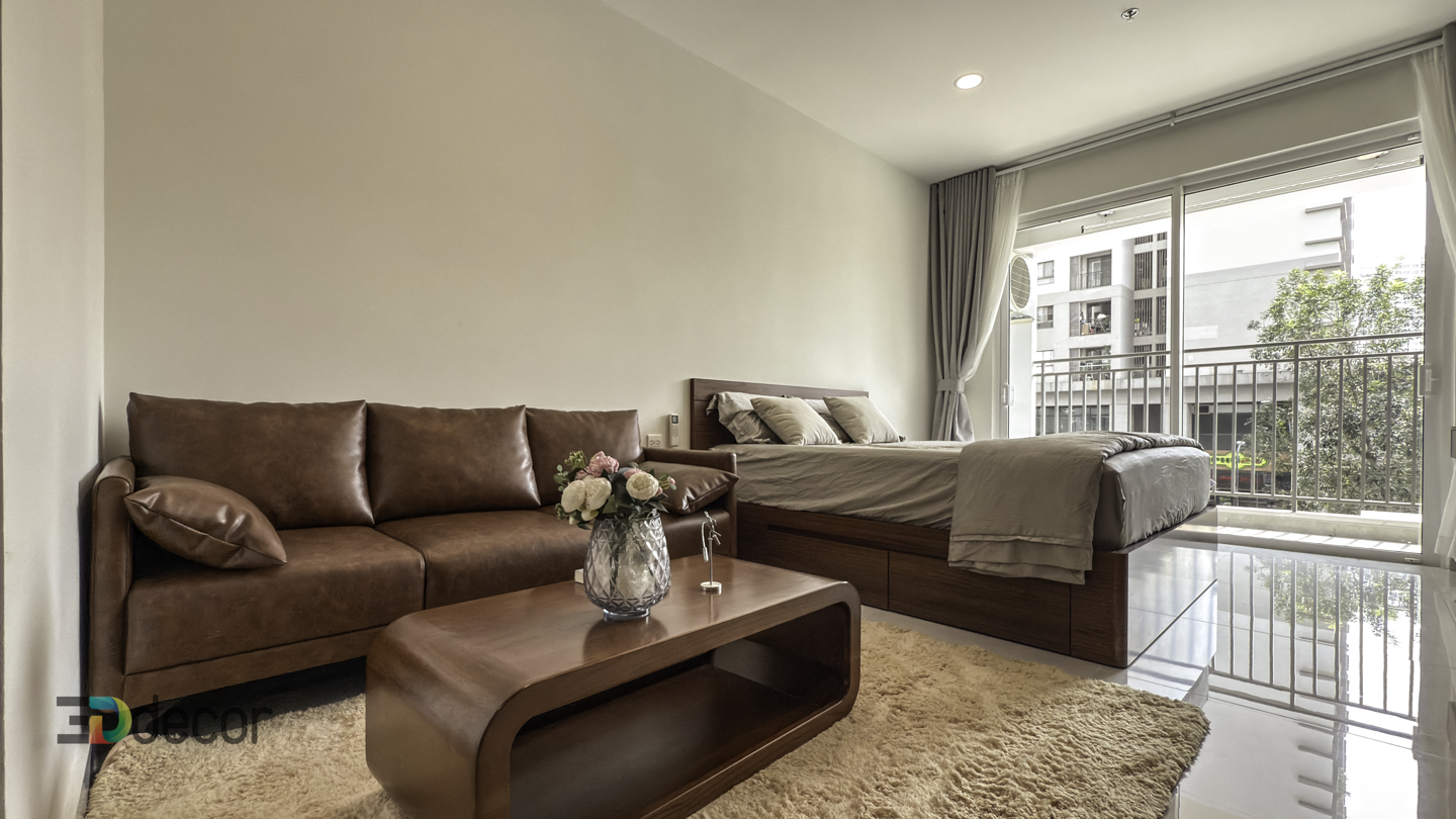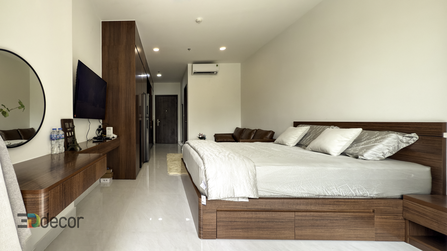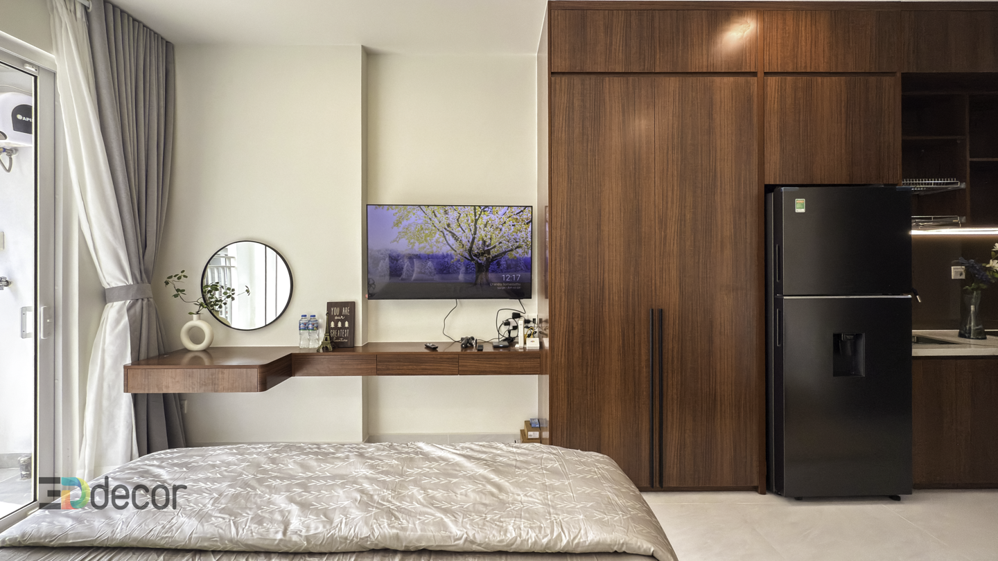 Không phải căn hộ nào cũng rộng rãi. Nhưng nếu biết cách bố trí nội thất hợp lý, ngay cả một căn hộ chỉ khoảng 25–30m² vẫn có thể đáp ứng đầy đủ nhu cầu sinh hoạt hằng ngày. Trong dự án lần này, 3Ddecor thiết kế dành riêng cho chủ nhà là người đàn ông lịch lãm, yêu thích sự tinh tế và có gu thẩm mỹ cao. Tổng thể không gian mang phong cách hiện đại tối giản kết hợp tông gỗ trầm, tạo cảm giác sang trọng, giống như một phòng suite khách sạn cao cấp nhưng vẫn đảm bảo công năng sinh hoạt hằng ngày.