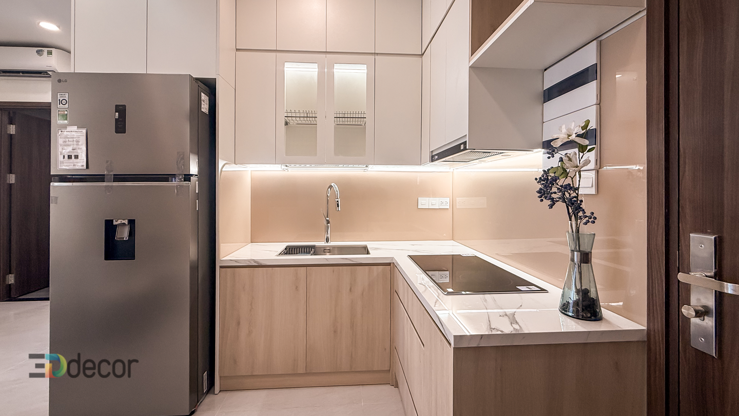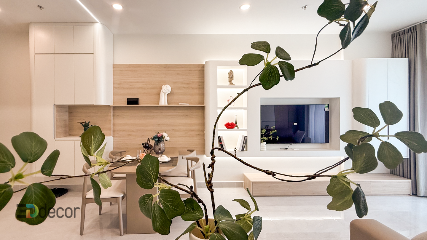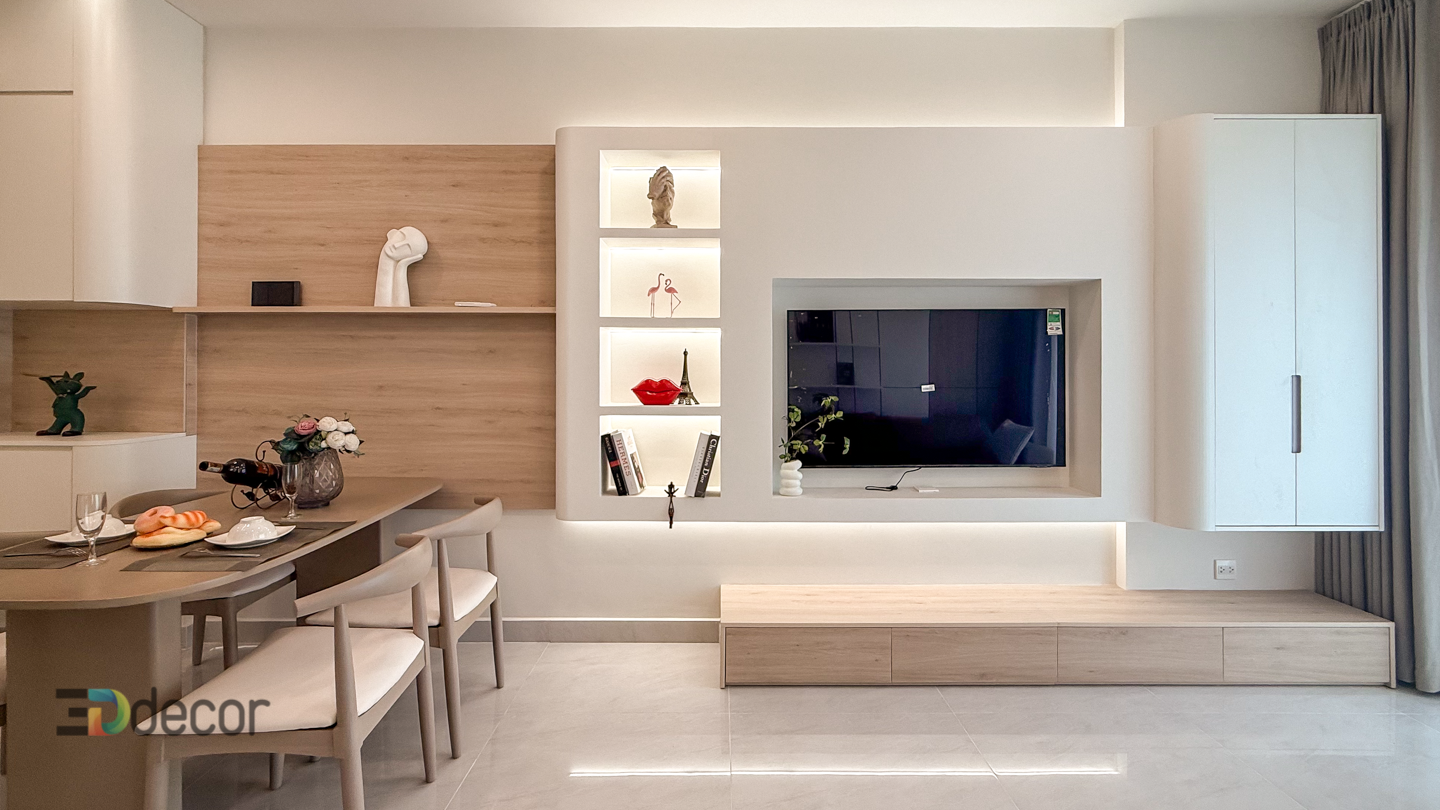 Thiết kế đa năng: Khu vực kệ TV, tủ trang trí âm tường và hệ tủ bếp chữ L được thiết kế gọn gàng, tăng cường công năng và lưu trữ hiệu quả.