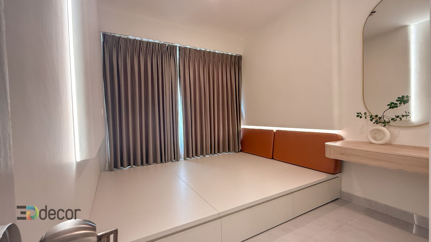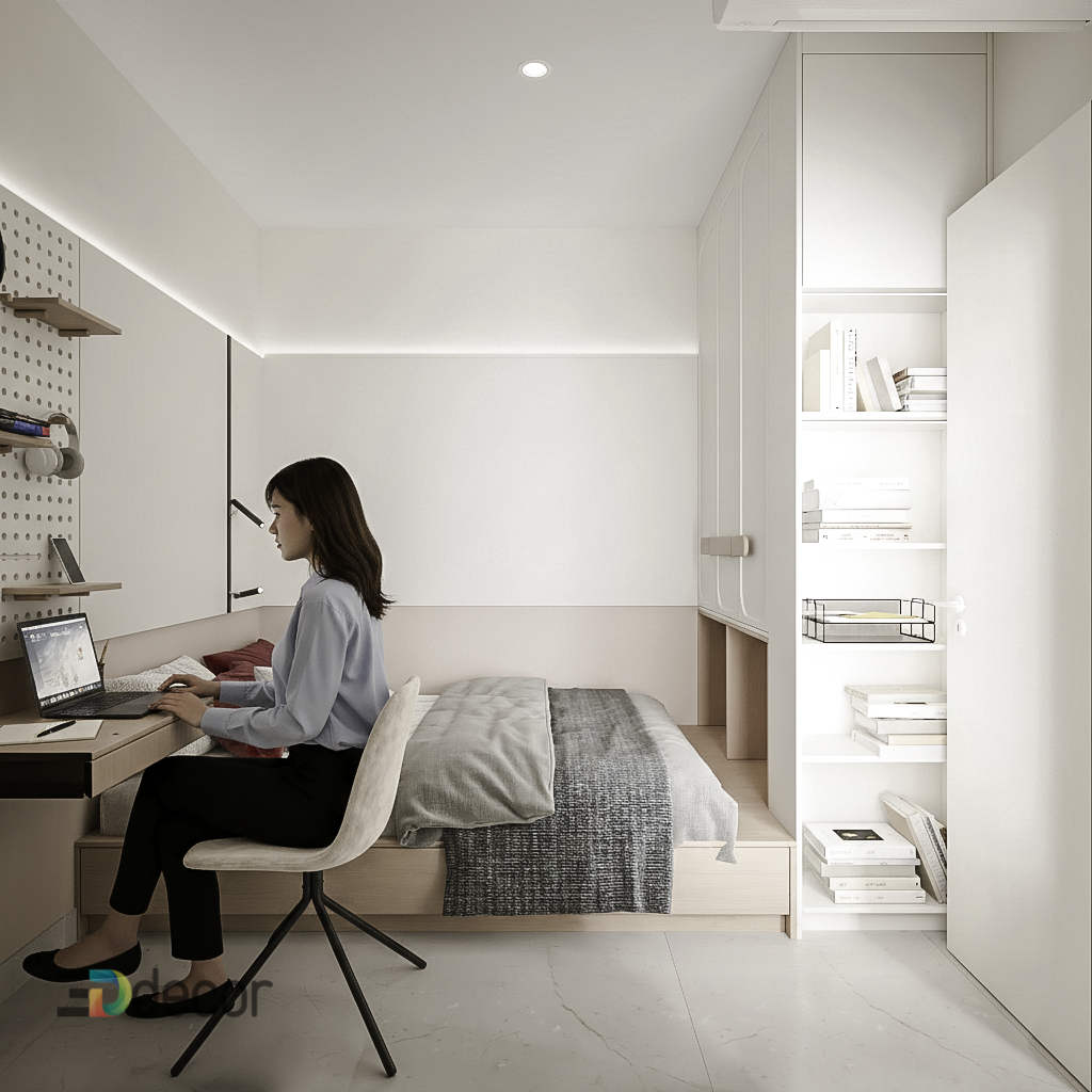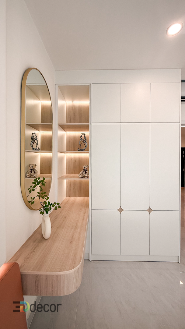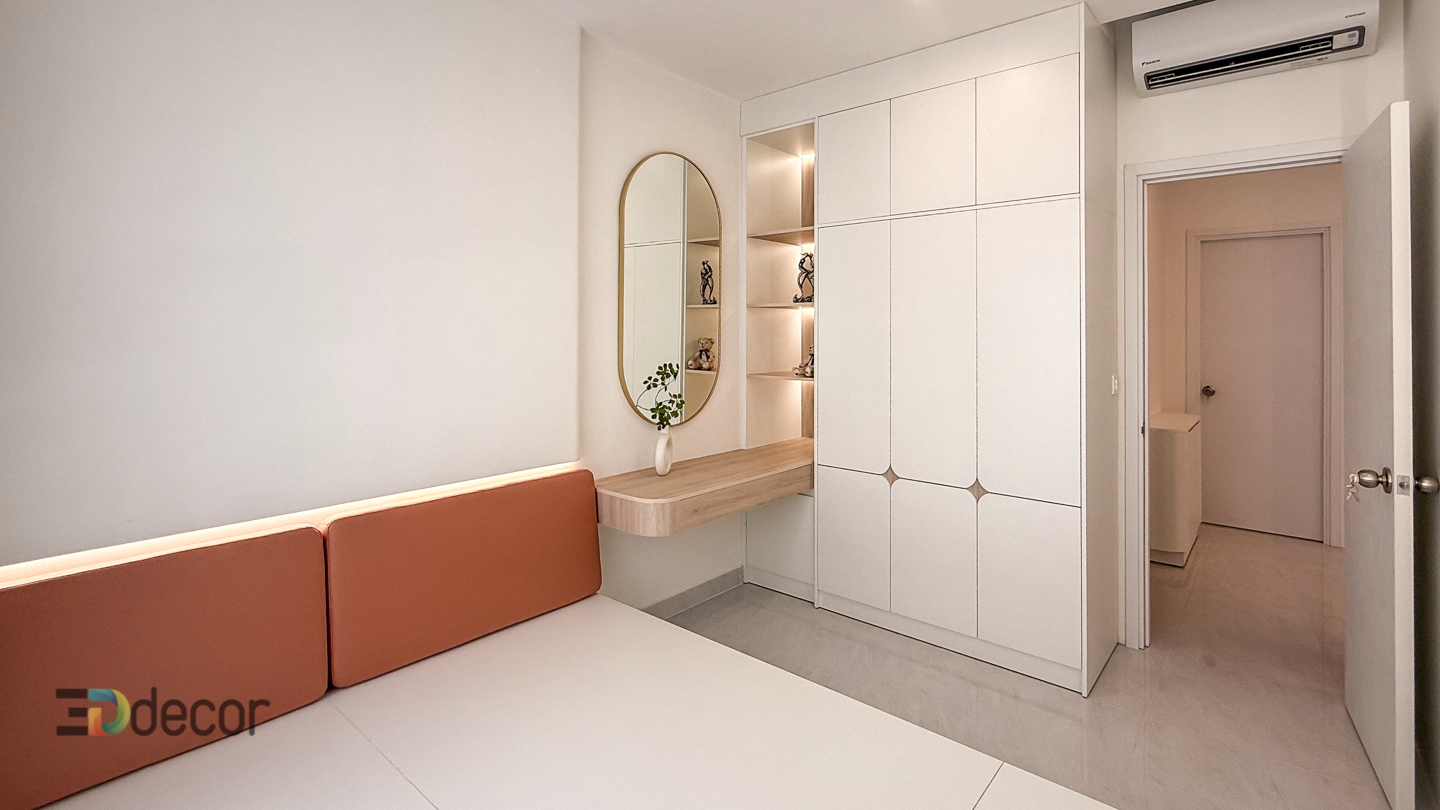 Phòng ngủ tiện nghi: Tối ưu không gian với tủ quần áo cánh phẳng lớn, bàn trang điểm/bàn làm việc nhỏ gọn kết hợp kệ trang trí có ánh sáng hắt