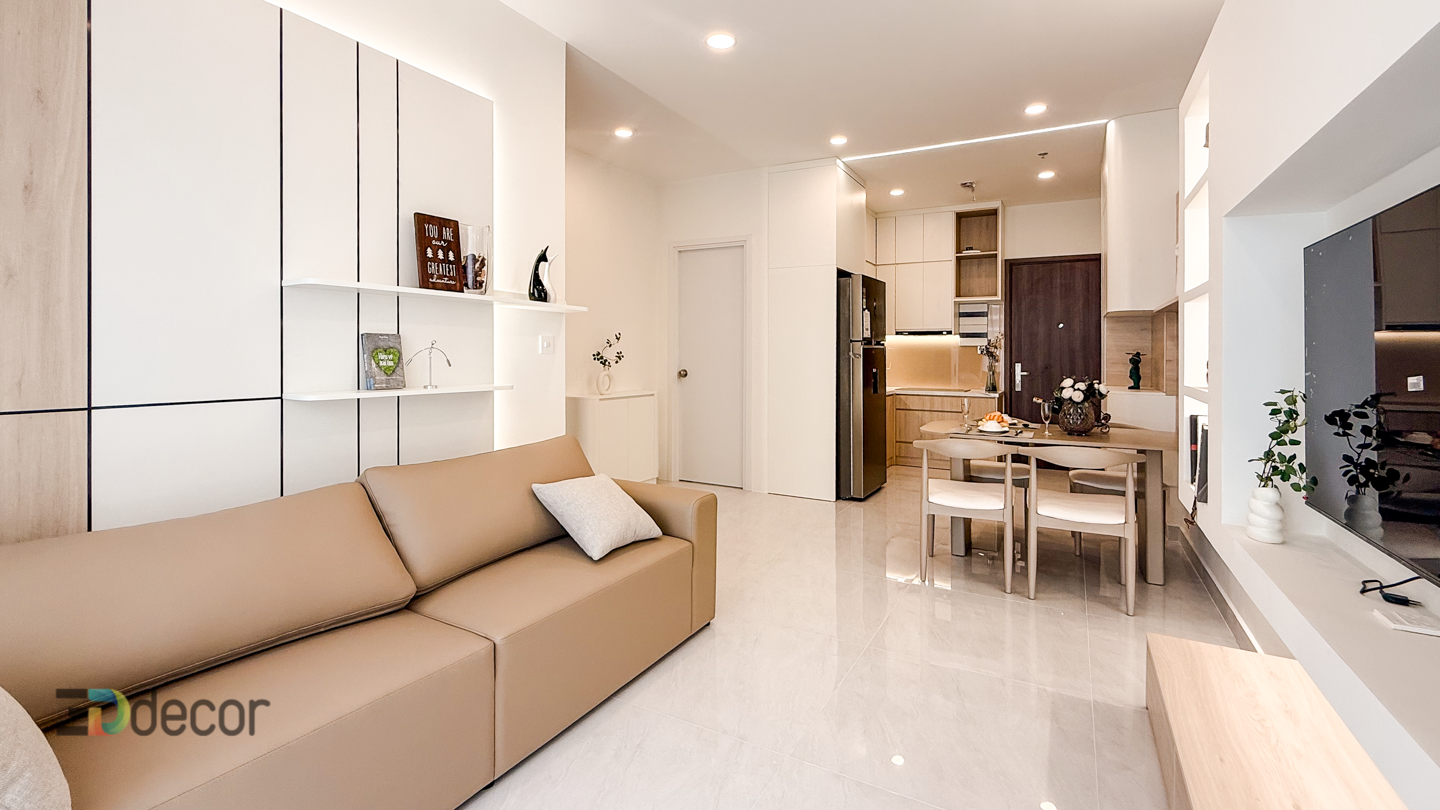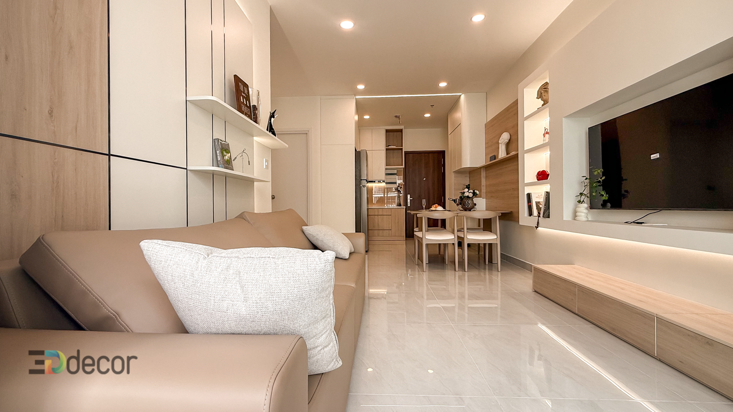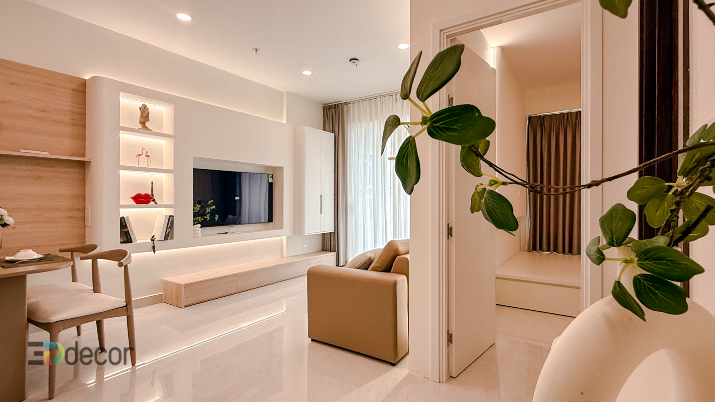Với diện tích nhỏ gọn, căn hộ được tối ưu hóa hoàn hảo theo phong cách Hiện đại - Tinh tế, sử dụng tông màu Trắng, Kem và Gỗ sáng làm chủ đạo.