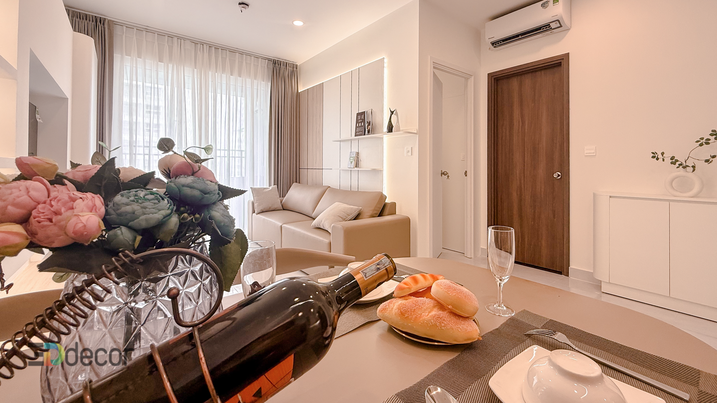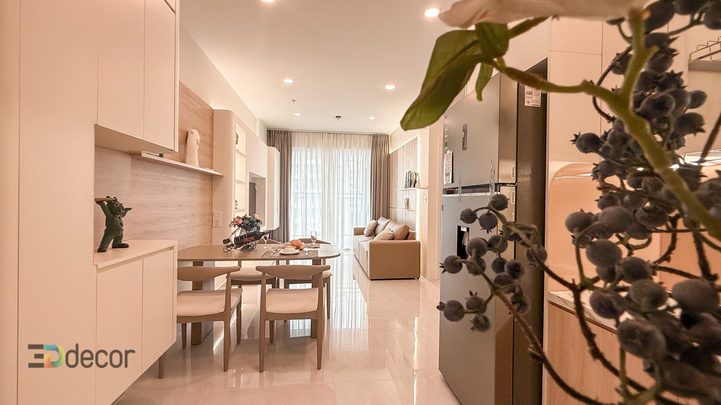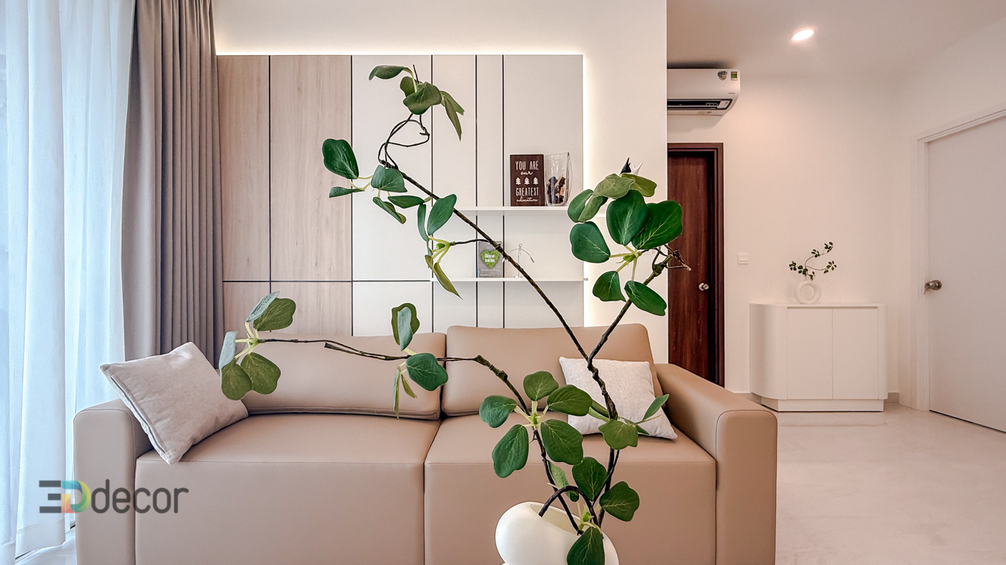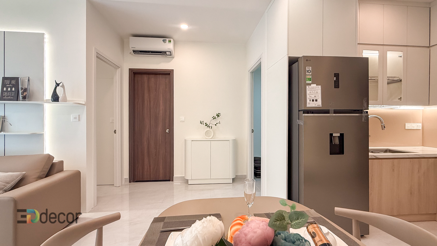 Với diện tích nhỏ gọn, căn hộ được tối ưu hóa hoàn hảo theo phong cách Hiện đại - Tinh tế, sử dụng tông màu Trắng, Kem và Gỗ sáng làm chủ đạo.