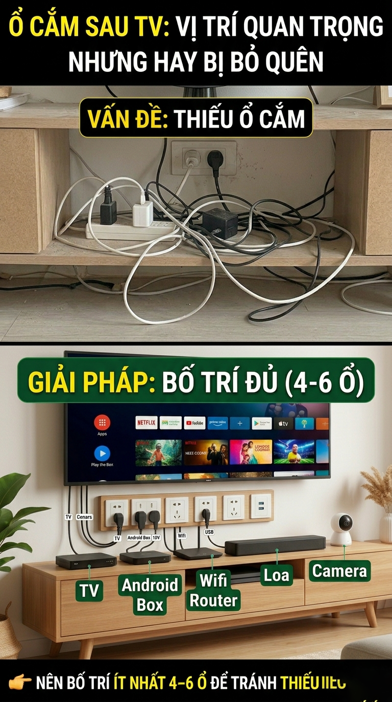 Nên bố trí từ 4 – 6 ổ cắm phía sau hoặc âm tường sau TV để đảm bảo sử dụng lâu dài.