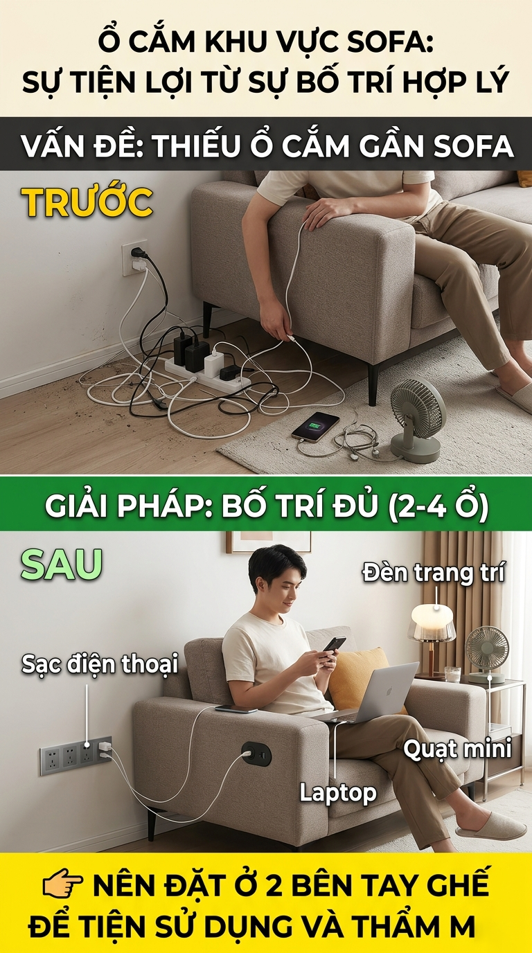 - Bố trí ổ cắm ở hai bên sofa