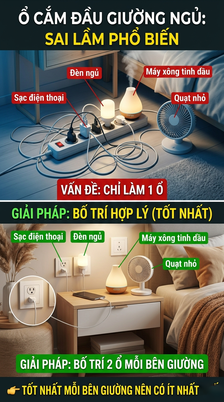 - Mỗi bên giường nên có tối thiểu 2 ổ cắm