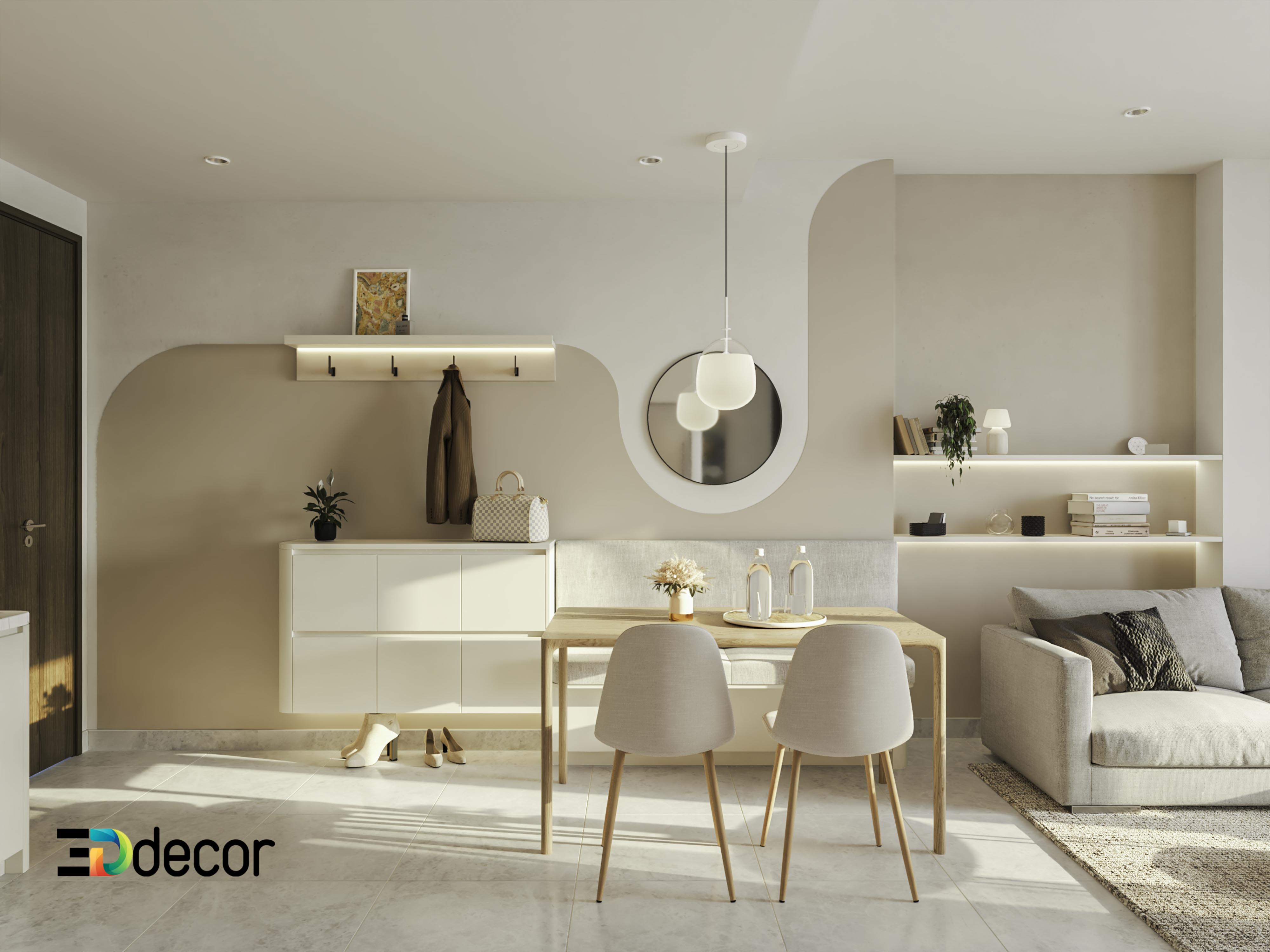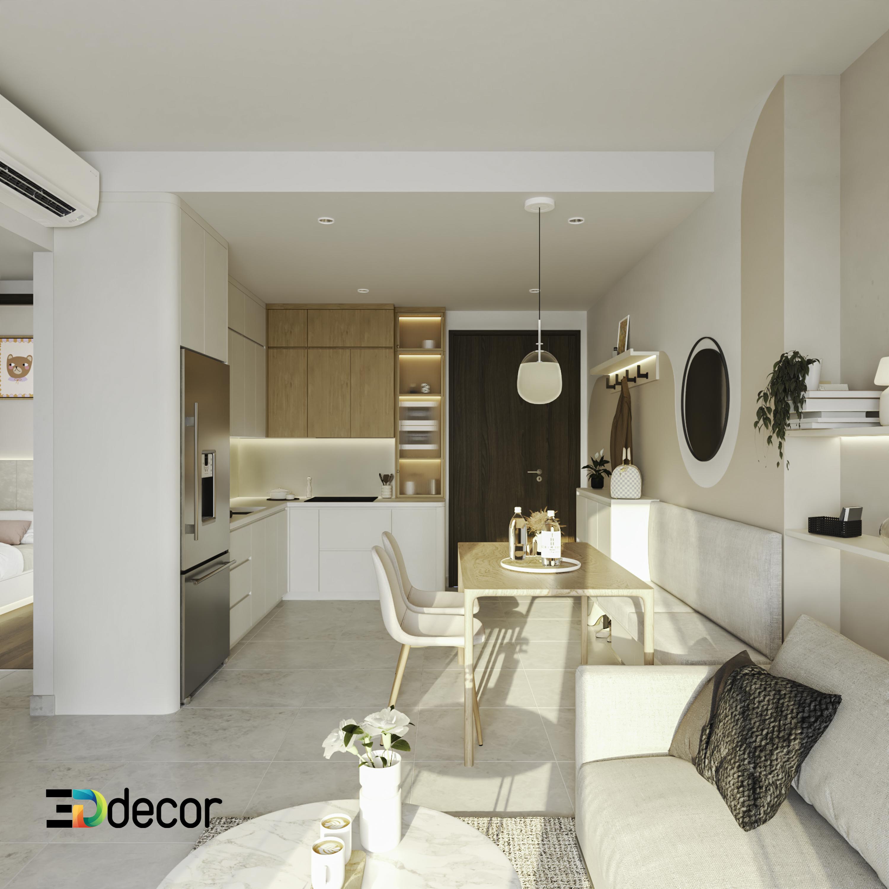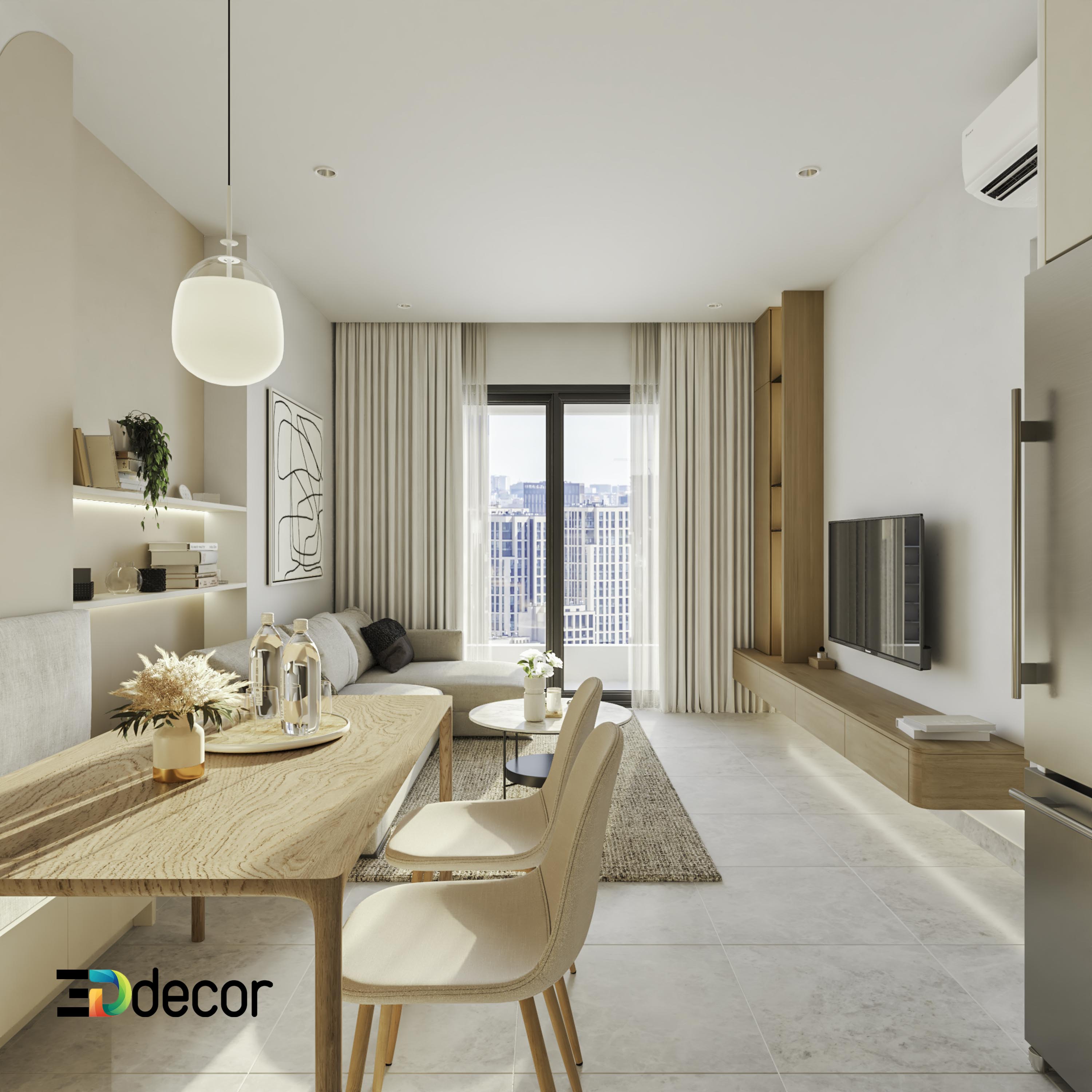 Căn hộ được lựa chọn tông màu kem – be – gỗ tự nhiên làm chủ đạo, giúp không gian trở nên thoáng đãng và sáng sủa hơn. Phòng khách liên thông với bếp – bàn ăn, tạo cảm giác rộng mở, đồng thời tăng sự kết nối trong sinh hoạt hằng ngày.