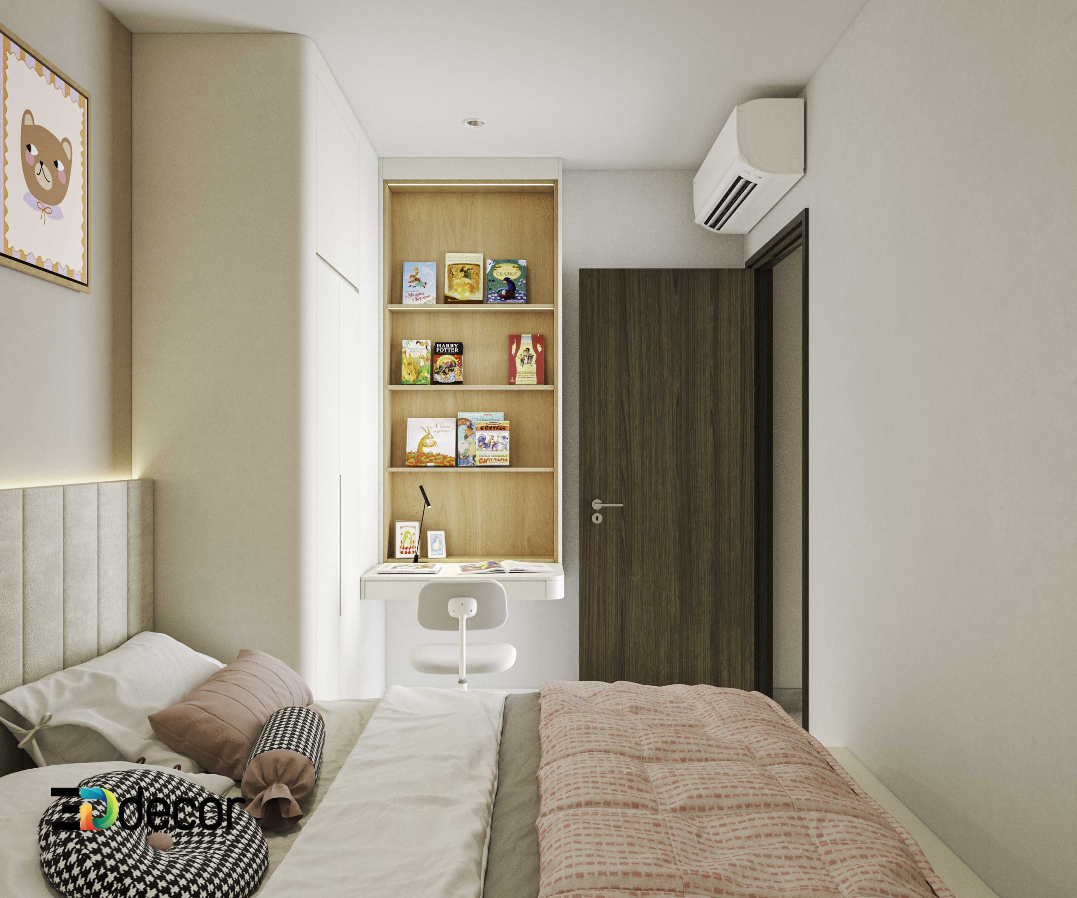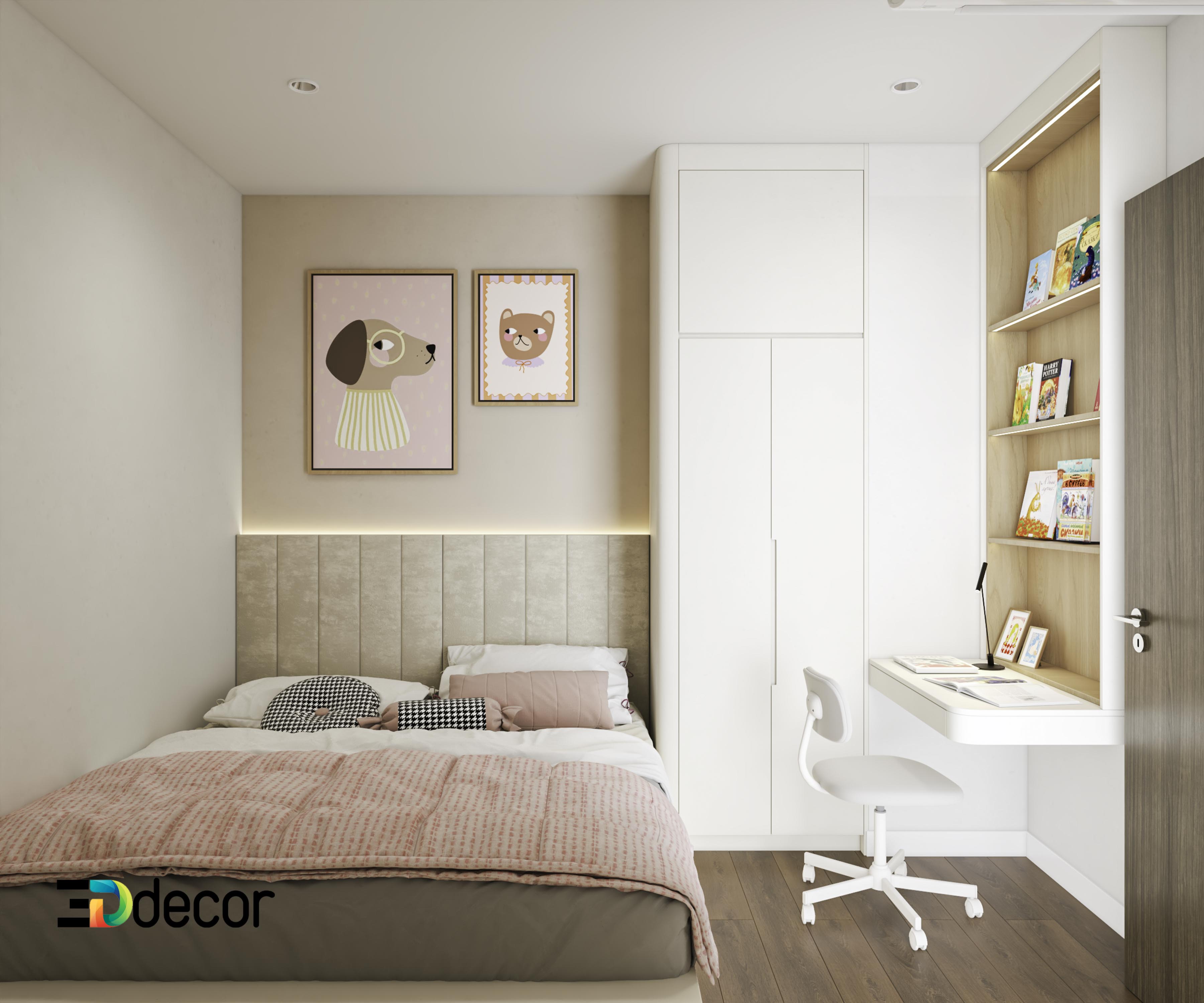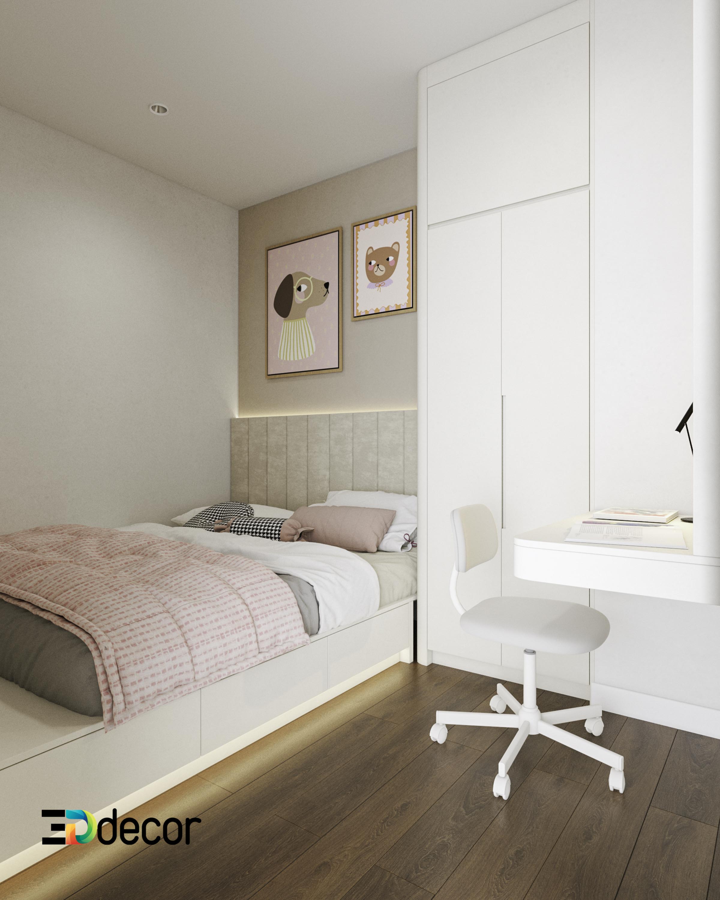 - Phòng ngủ trẻ em: trang trí nhẹ nhàng với gam màu hồng pastel, bàn học gọn gàng và kệ sách thông minh, vừa đáng yêu vừa tiện lợi cho việc học tập.