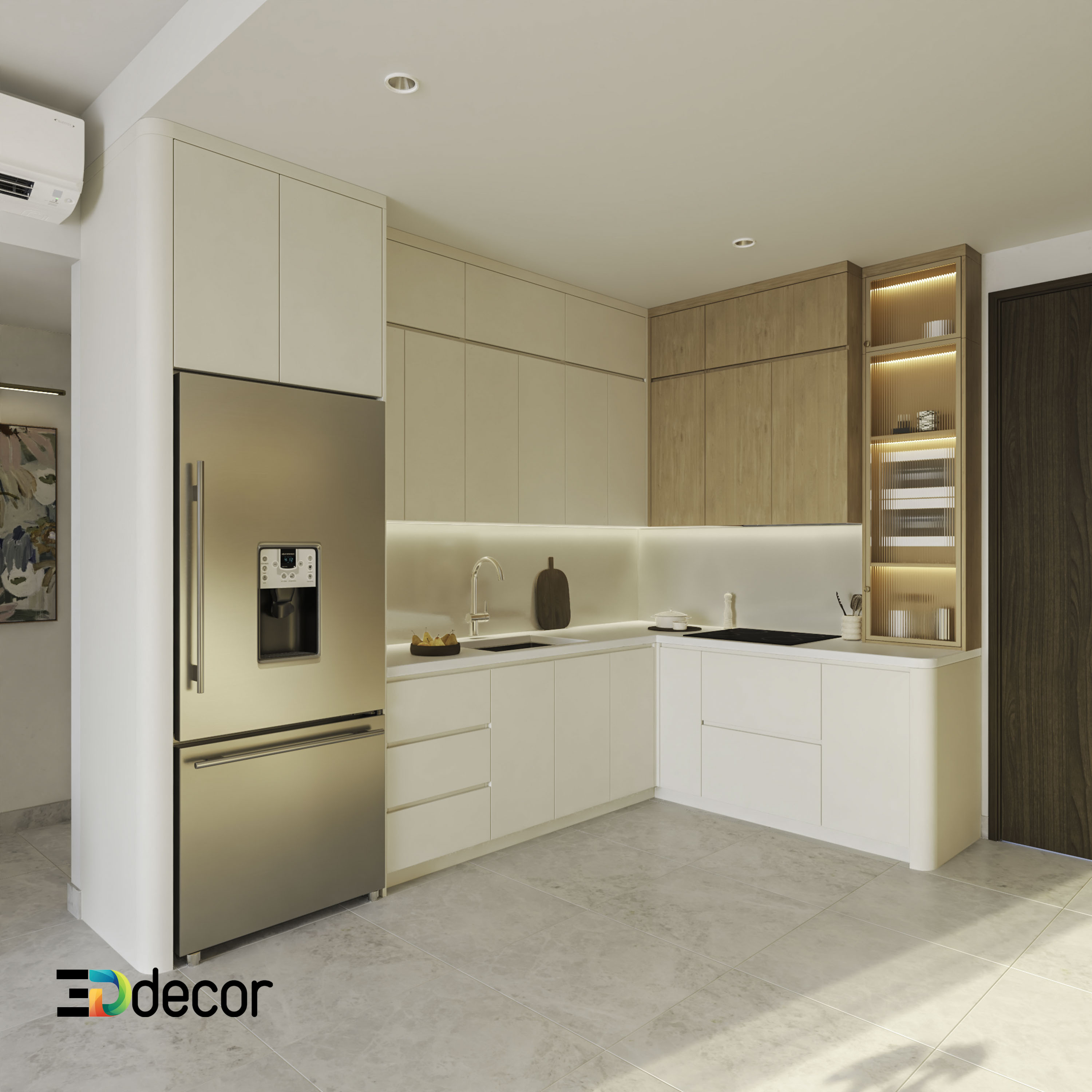 Bếp & bàn ăn: thiết kế liền mạch, tủ bếp trên – dưới với chất liệu MDF chống ẩm, gam màu trắng kết hợp vân gỗ giúp căn bếp vừa hiện đại vừa ấm cúng.