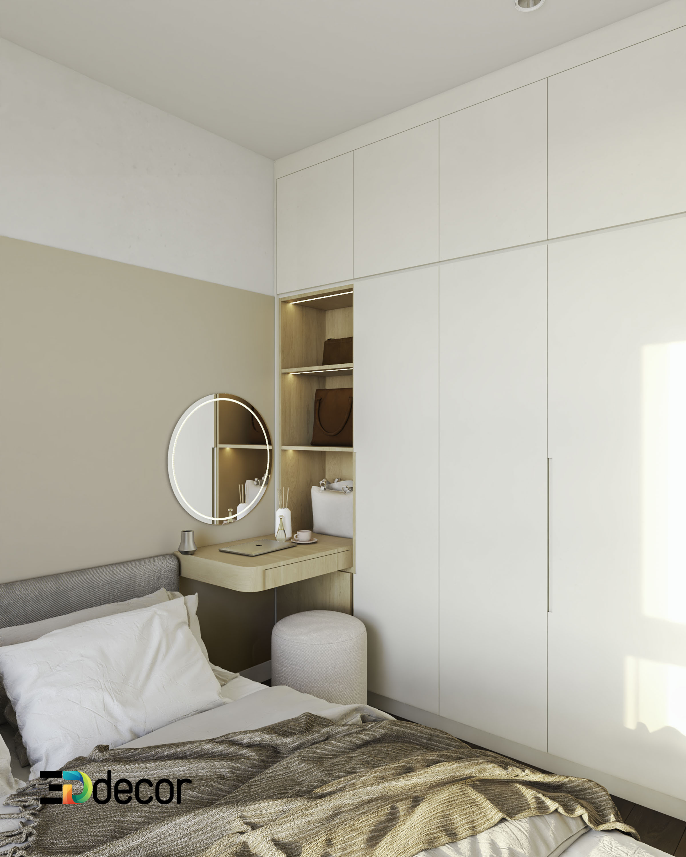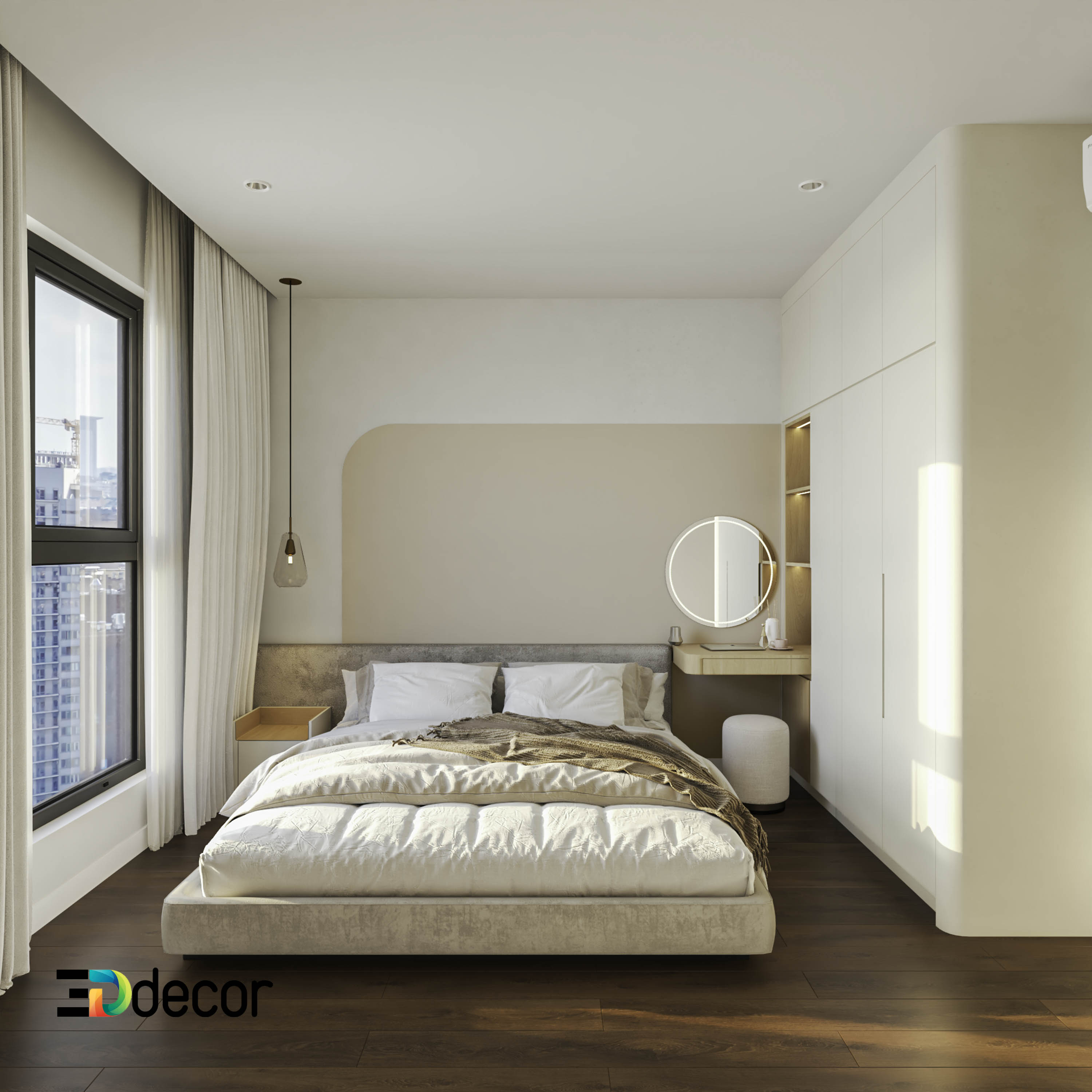 Phòng ngủ master: sử dụng giường thấp, tủ âm tường và góc bàn trang điểm, đem lại sự riêng tư và thư giãn tuyệt đối.