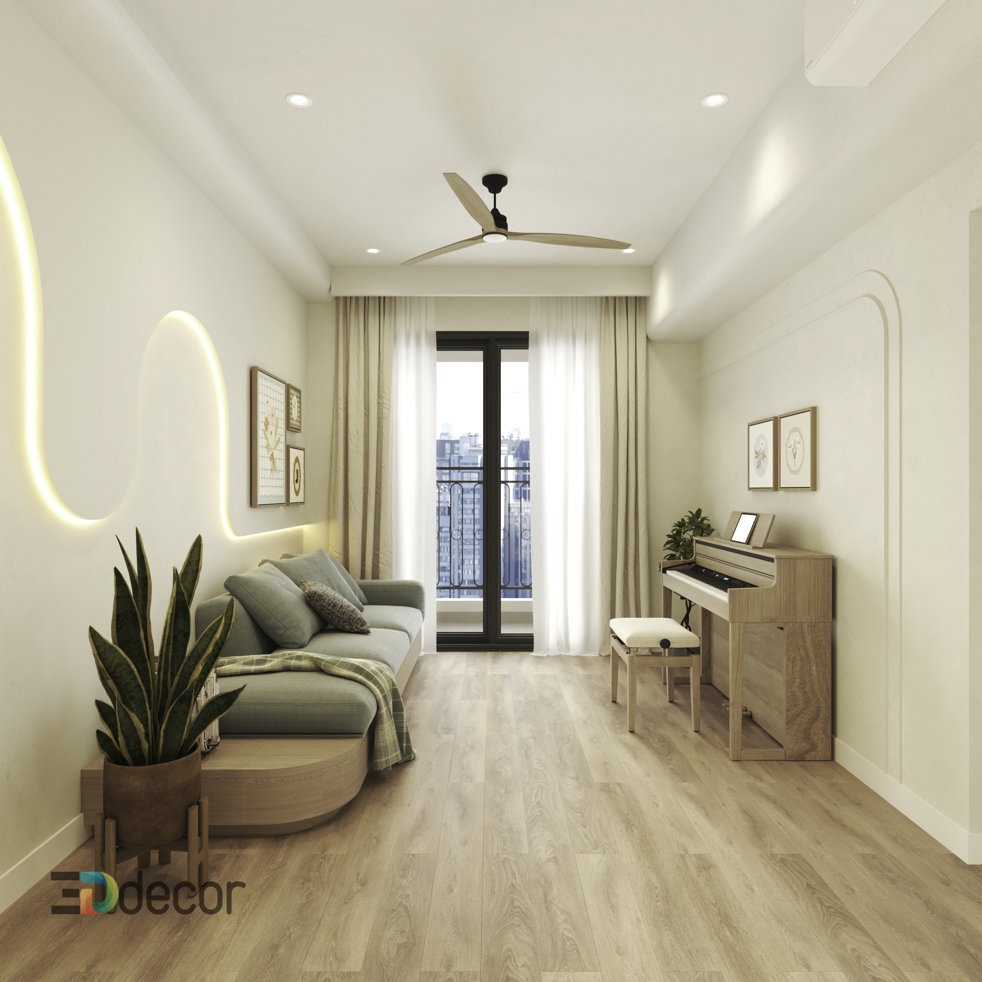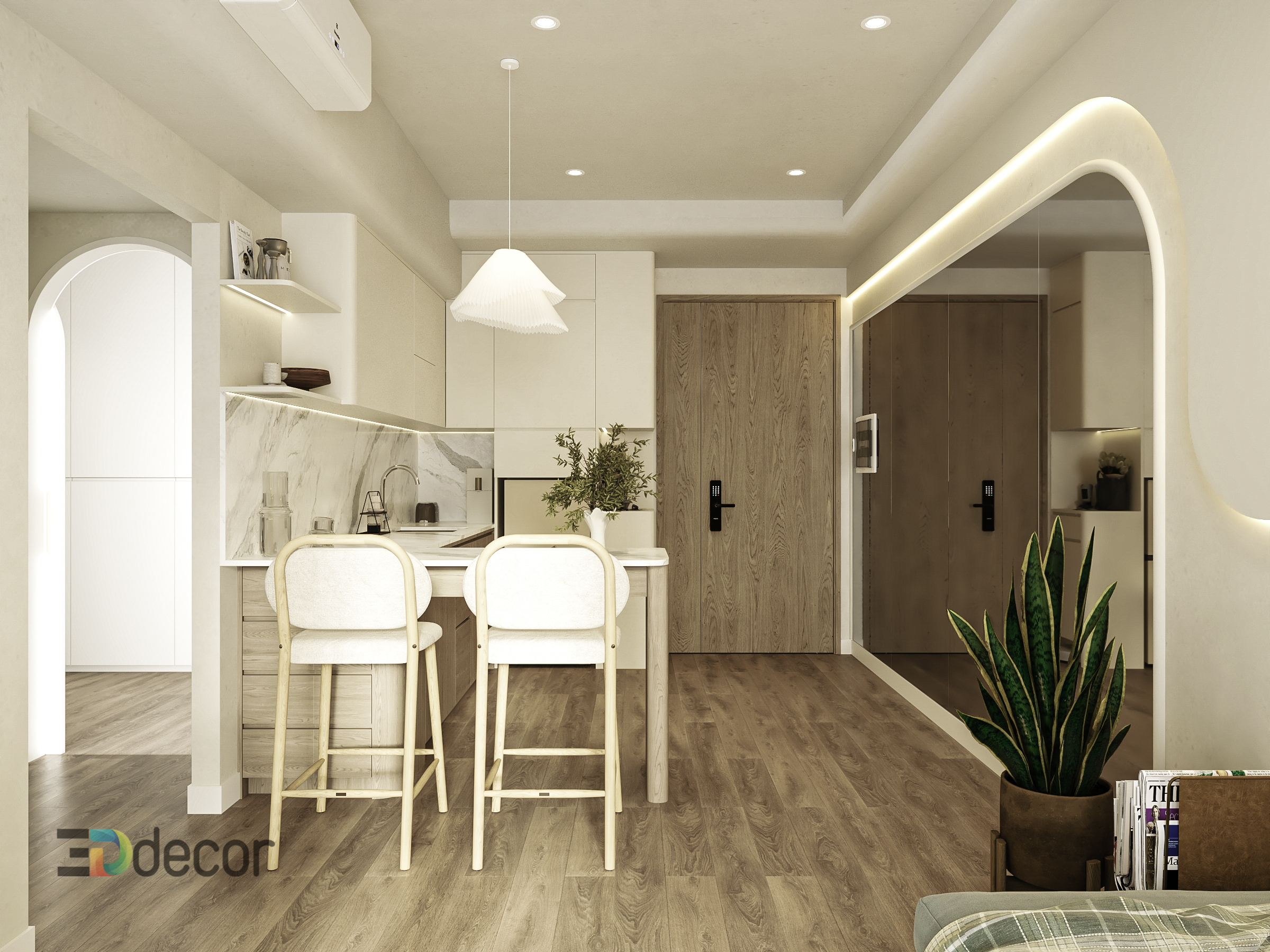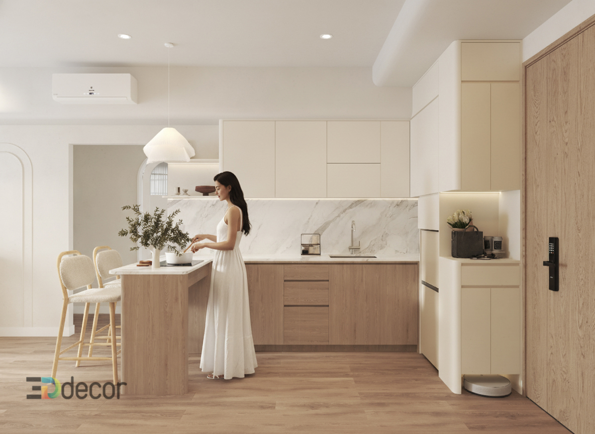1. Tông màu Kem & Gỗ Sáng – Dịu dàng và Sang trọng: Khác biệt hoàn toàn với sự ồn ào của phố thị, căn hộ đón bạn bằng một bảng màu Mềm mại, Ấm áp: Trắng kem, Beige và Gỗ Tự nhiên Sáng. Mỗi chi tiết đều như được thì thầm, nhẹ nhàng ôm ấp mọi giác quan của bạn. Ánh sáng tự nhiên từ khung cửa sổ lớn được khuếch tán, tạo nên một cảm giác thanh bình, thư thái khó tìm thấy.