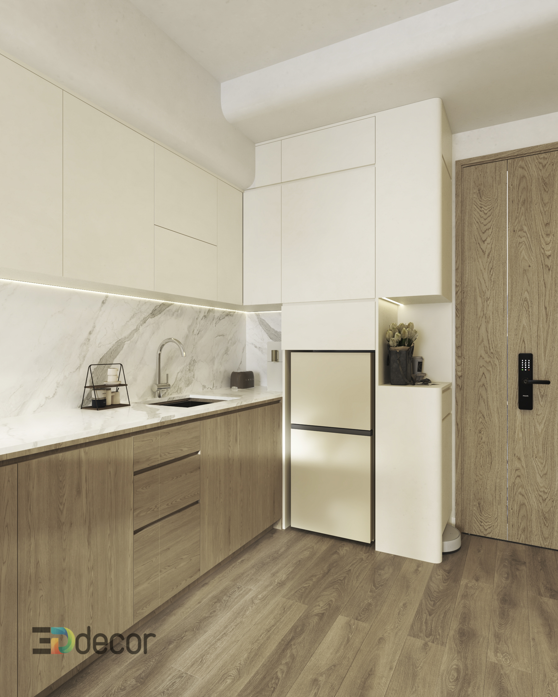 Hệ Tủ Bếp: Thiết kế cánh phẳng, tích hợp gọn gàng, mang lại sự tiện nghi tối đa mà vẫn giữ được vẻ ngoài tinh khiết.