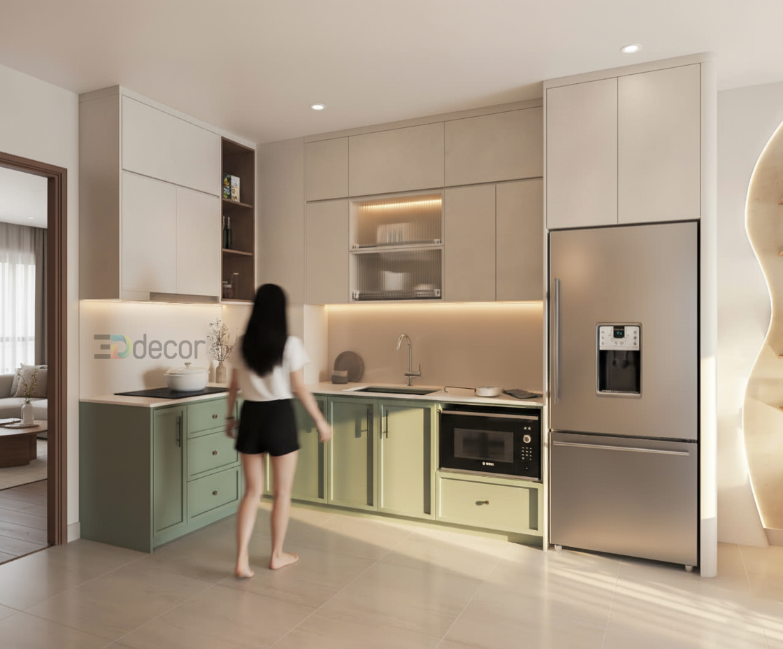 Sức mạnh của Gam màu Tối Giản và Tinh tế: Chúng tôi đã lựa chọn bảng màu Kem (Beige) – xanh lá – màu Gỗ Tự nhiên Sáng làm chủ đạo. Sự kết hợp này không chỉ mang lại cảm giác thanh lịch, thư thái mà còn là giải pháp thị giác hoàn hảo, giúp tối ưu hóa không gian và ánh sáng, tạo cảm giác thông thoáng và hiện đại, hoàn toàn phù hợp với tinh thần sống năng động của Vinhomes.